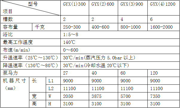 GYX-高温高压液流染色机特点低浴比高速液流染色机,单机头双染色槽同步染色系统可大幅减少染色差情形发生,并可缩短布匹在染缸内每一循环时间,提高染色均染效果。技术参数
